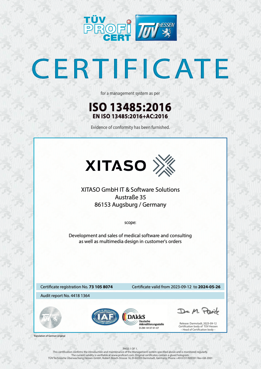 XITASO is constantly evolving, and that also applies to the highly demanding medical engineering branch. Especially here, certifications are an important way of emphasizing that we can provide our customers with excellent support. Often, they are even a precondition for the implementation of our customer’s projects.